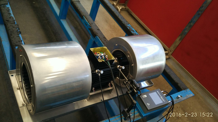 圖片說明:上圖是列車上空調(diào)專用風(fēng)機(jī),精度要求之后,利用風(fēng)機(jī)專用動平衡儀SB-8002,最后校準(zhǔn)到0.015mm/s